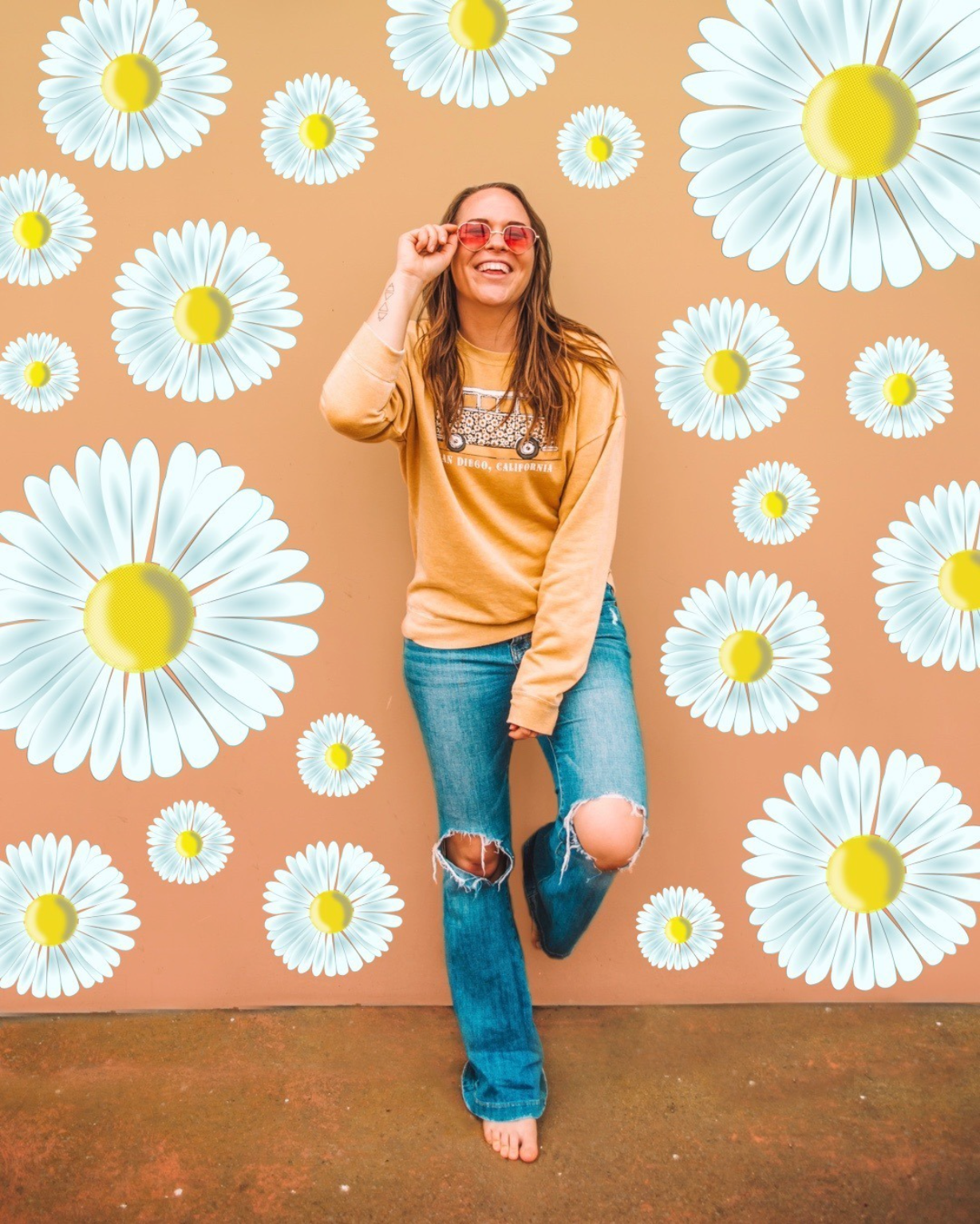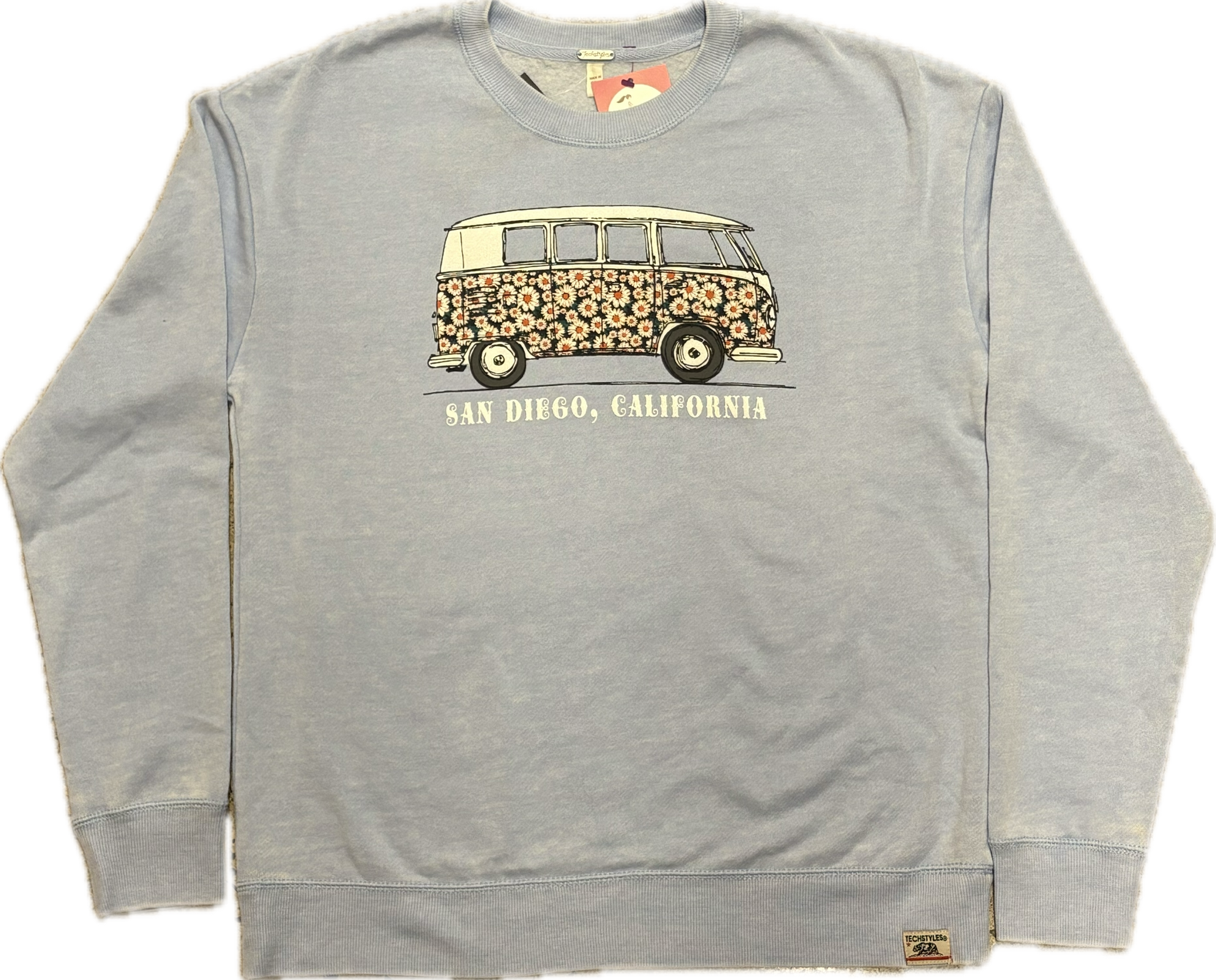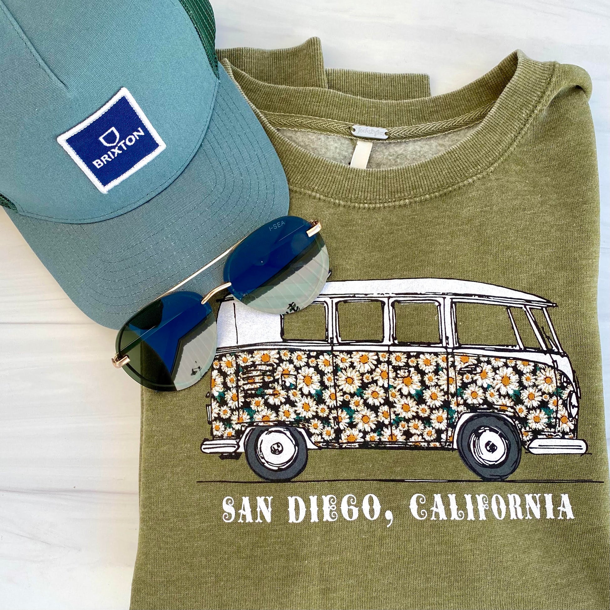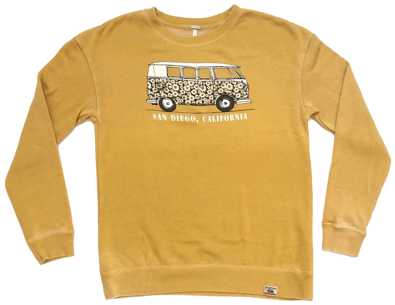 Boho meets the beach with a bus full of daisies. Time to cruise the boardwalk in this super soft crew neck sweatshirt!