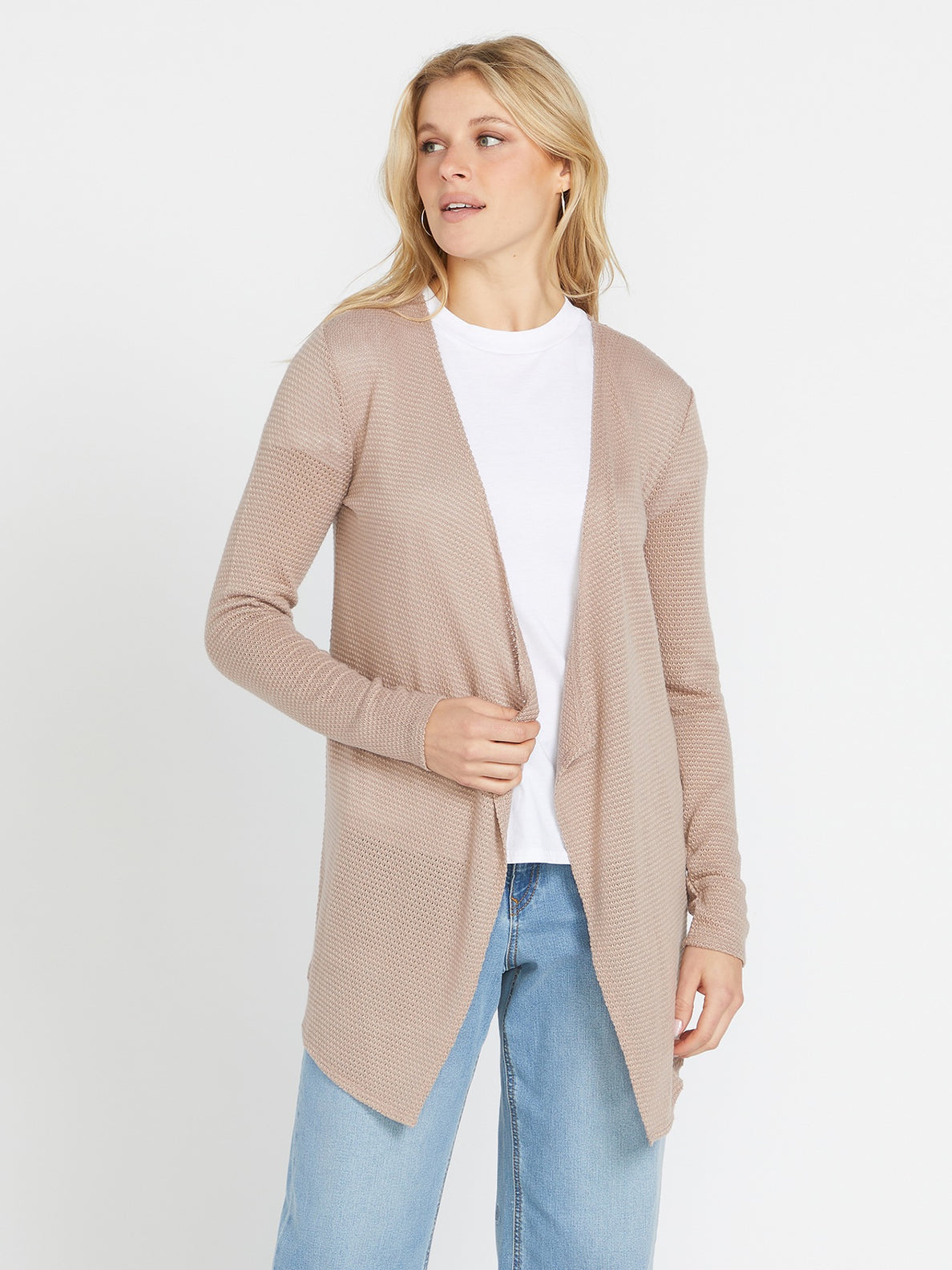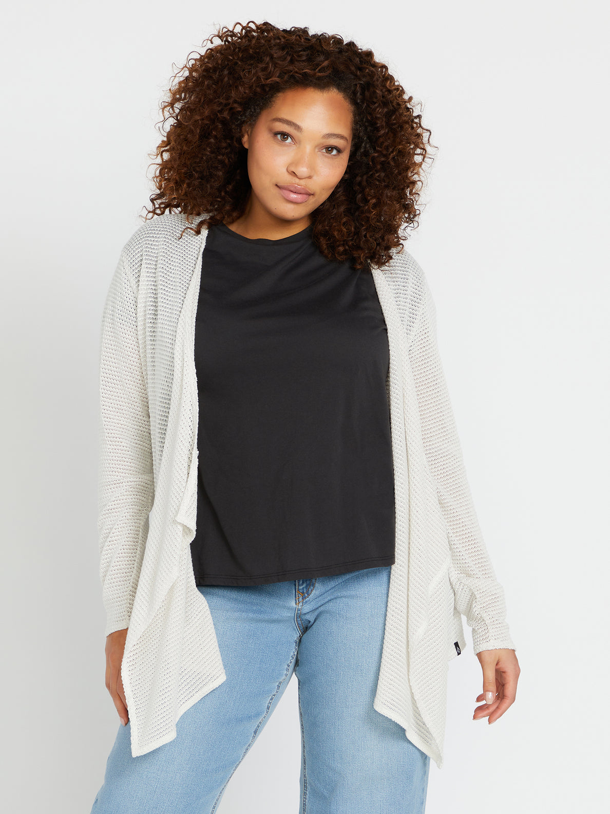 A lightweight layer that looks good any time of year, the Go Go Wrap is a textured open front sweater.